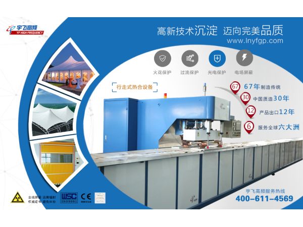 宇飞膜材料专用高周波焊接机,专业用于建筑棚膜、快速门、气艇及PVC/TPU等材料的熔接热合。
