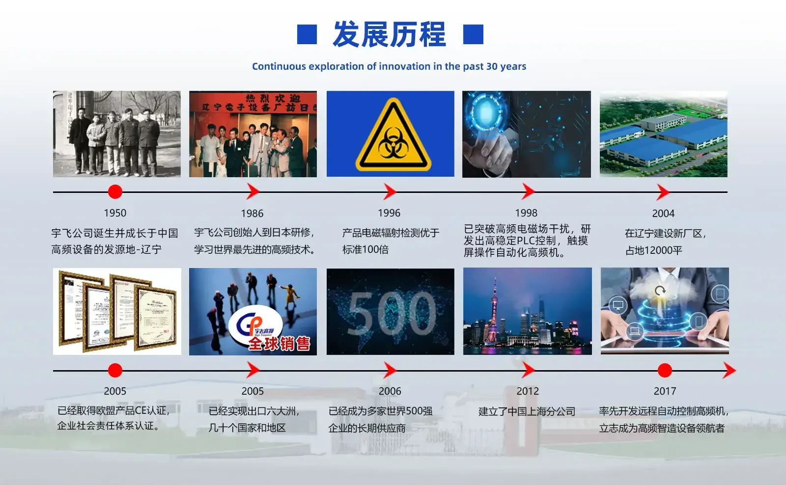 辽宁宇飞高频设备有限公司是专业从事高频设备,高周波设备,超声波设备及自动化生产线研发和制造的科技型企业。公司座落于辽宁省沈阳市经济圈内的铁岭市经济开发区起步区。占地面积一万一千平方米,厂房面积六千多平方米。辽宁宇飞高频上海分公司位于上海市嘉定区,与宇飞辽宁公司南北呼应,全面为南北方客户提供更便捷的技术和售后服务。公司是一家具有独立进出口资格的科技研发企业,已经通过欧盟产品CE认证,及企业社会责任体系认证。公司在成立当年便实现出口并将设备销往多家世界500强企业。此后宇飞公司先后实现了与美国,俄罗斯,法国,瑞典,瑞士,土耳其,斯洛伐克,乌克兰,印度,越南等多家大企业的合作,并得到各国......